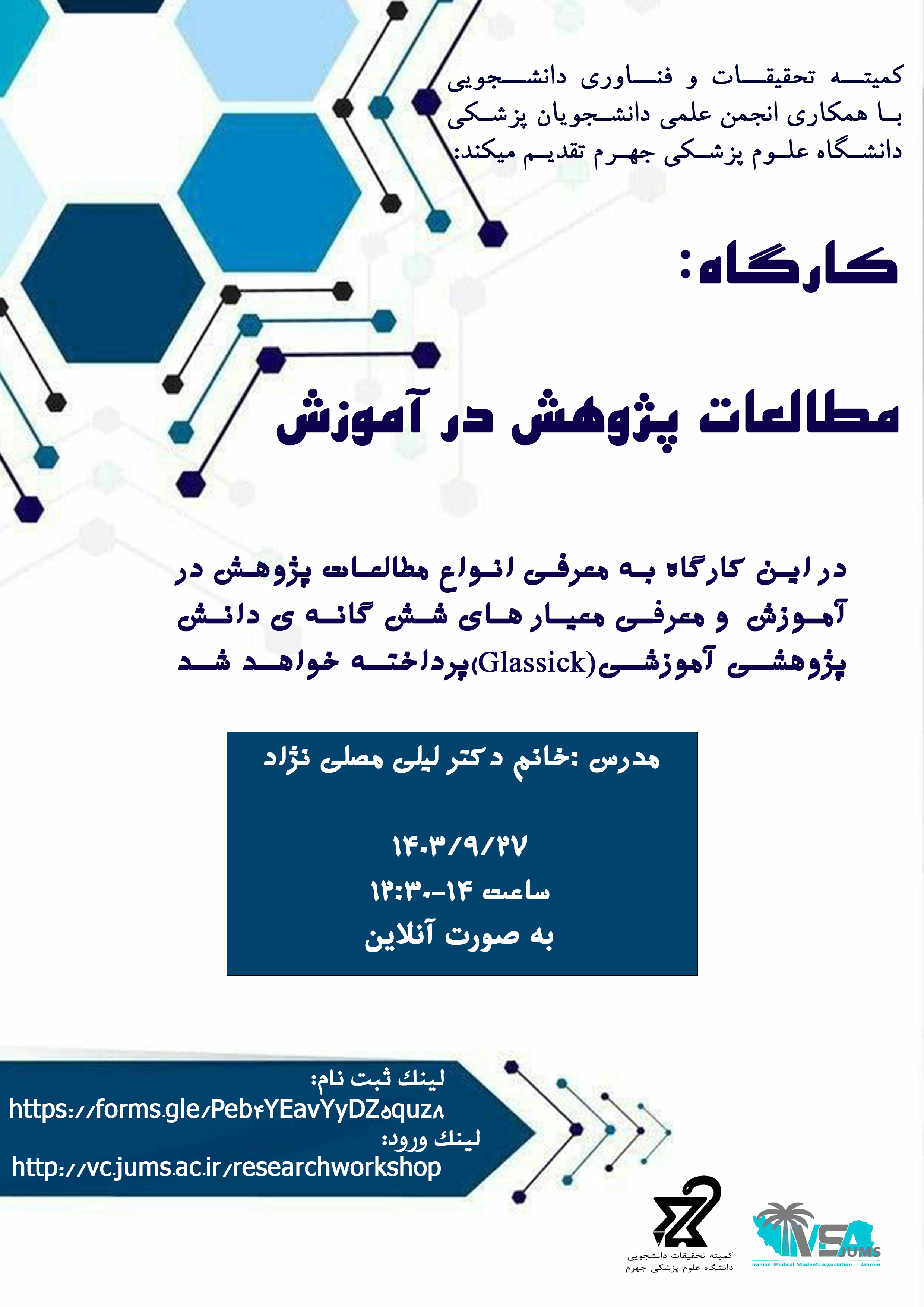 کمیته تحقیقات و فناوری دانشجویی با همکاری انجمن علمی دانشجویان پزشکی دانشگاه علوم پزشکی جهرم برگزار می کند: کارگاه مطالعات پژوهش در آموزش
