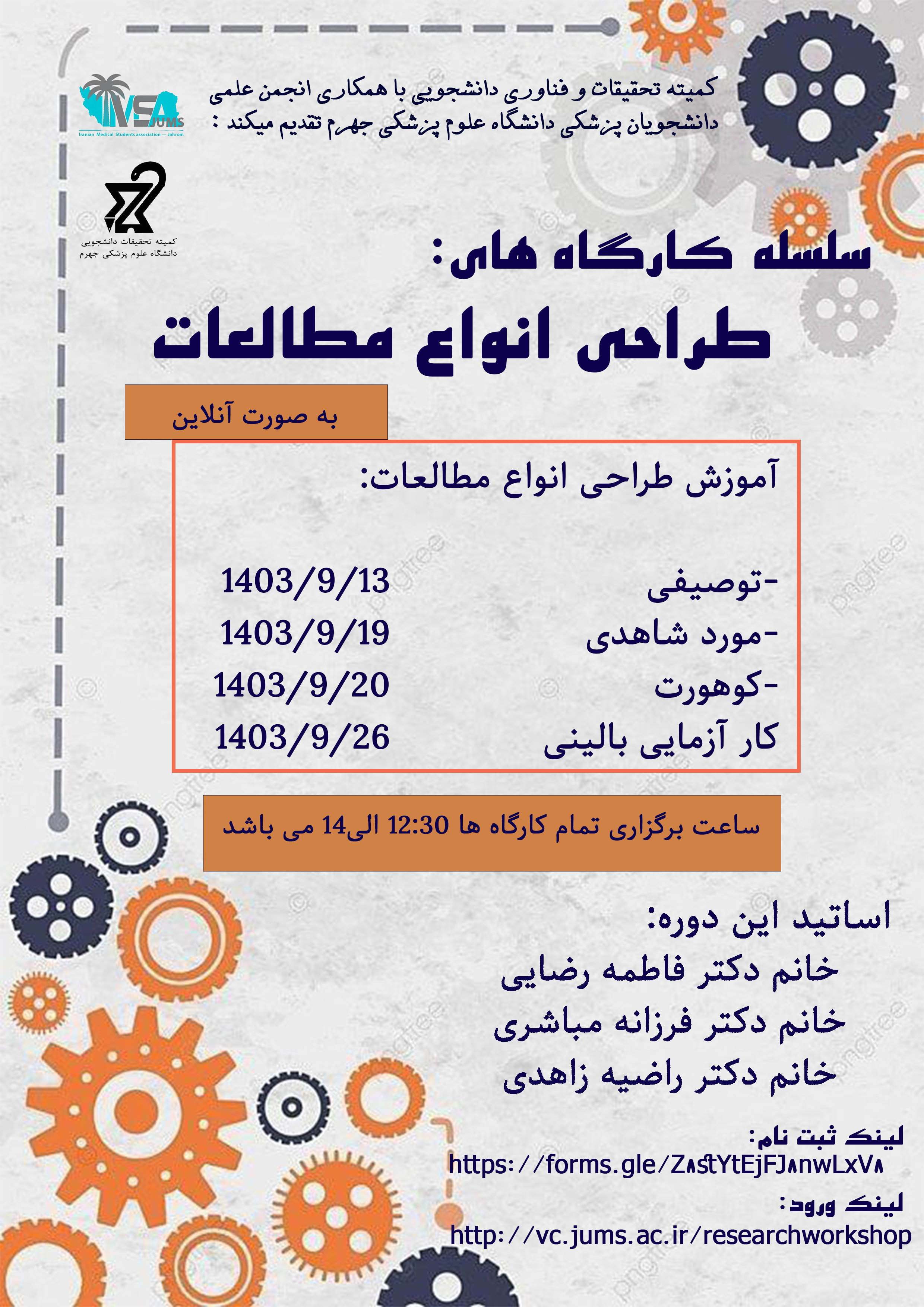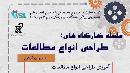 کمیته تحقیقات و فناوری دانشجویی با همکاری انجمن علمی دانشجویان پزشکی دانشگاه علوم پزشکی جهرم برگزار می کند: سلسله کارگاه های طراحی انواع مطالعات