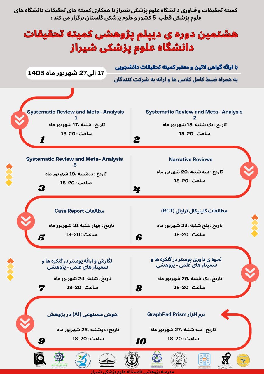 کمیته تحقیقات و فناوری دانشگاه علوم پزشکی شیراز با همکاری کمیته تحقیقات و فناوری دانشگاه های قطب5 کشور و دانشگاه علوم پزشکی گلستان برگزار می کند: هشتمین دوره دیپلم پژوهشی کمیته تحقیقات دانشگاه علوم پزشکی شیراز