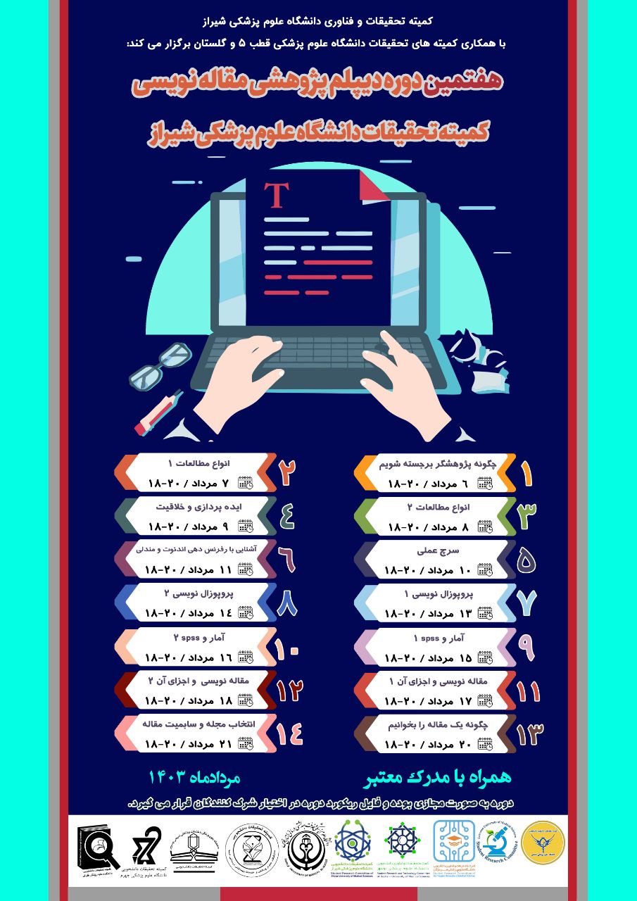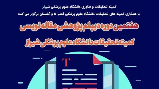 کمیته تحقیقات و فناوری دانشگاه علوم پزشکی شیراز با همکاری کمیته تحقیقات دانشگاه های علوم پزشکی قطب 5 و گلستان برگزار می کند: هفتمین دوره دیپلم پژوهشی مقاله نویسی