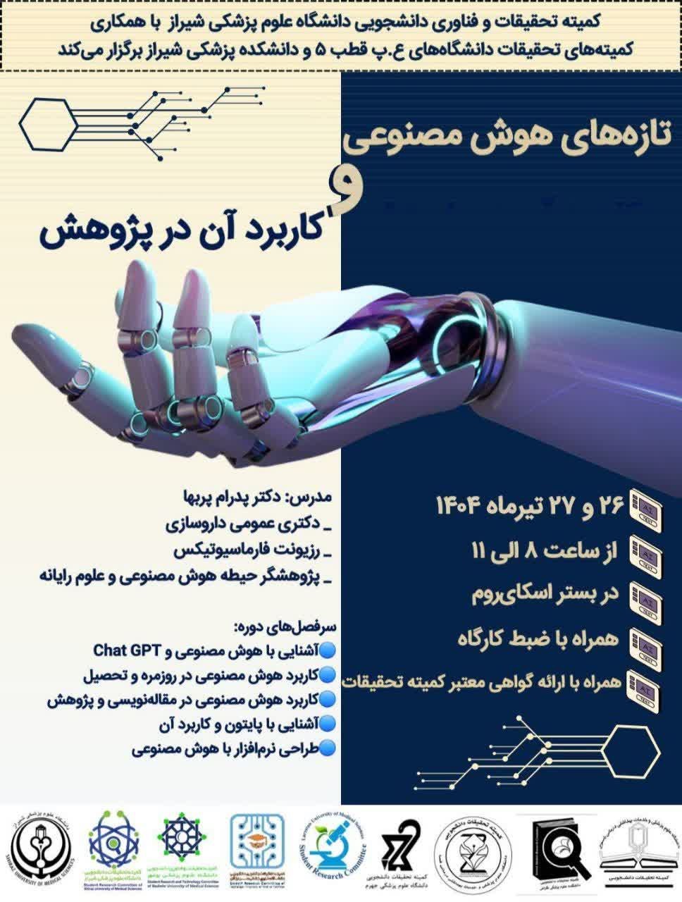 کمیته تحقیقات و فناوری دانشگاه علوم پزشکی شیراز با همکاری کمیته تحقیقات دانشجویی دانشگاه های علوم پزشکی قطب 5و دانشکده پزشکی شیراز برگزار می کند: تازه های هوش مصنوعی و کاربردآن در پژوهش